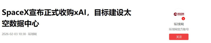 环球网:SpaceX宣布正式收购xAI,目标建设太空数据中心